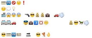 絵文字の文法のもう一つの例として、スタンス、つまり人が何かに対して持っている態度が絵文字の順序で最初に来るという観察があります。 上記の銀行強盗の絵文字の話では、最も感情的な顔が各シーケンスの最初にある。
